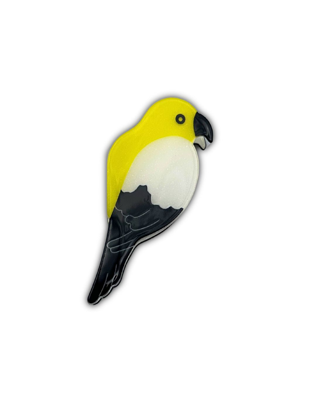 Un perroquet lumineux qui se pose dans les cheveux comme un rayon de soleil.